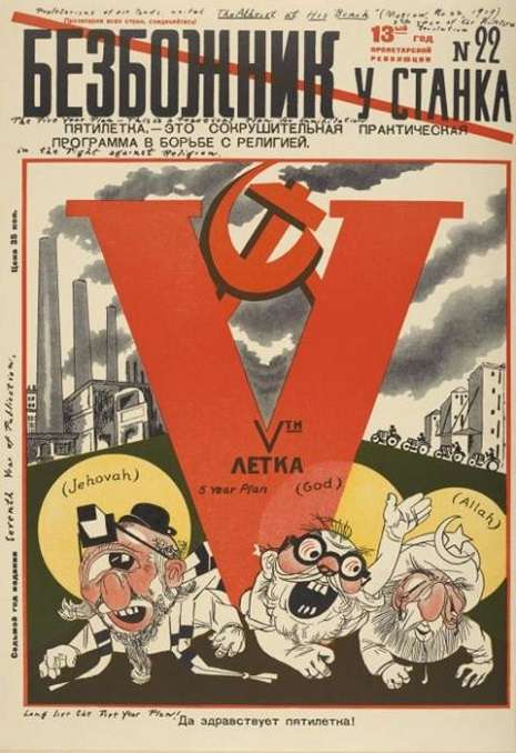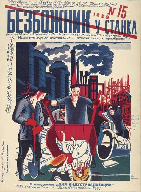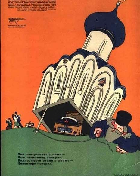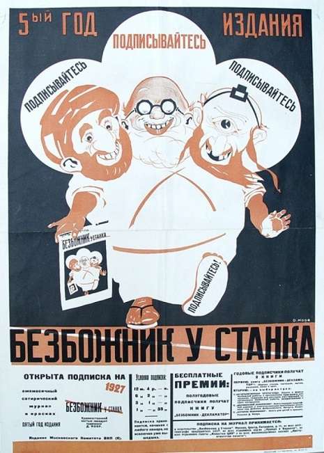 Οι παρακάτω εικόνες προέρχονται από το αντιθρησκευτικό περιοδικό Bezbozhnik, που σημαίνει Άθεος. Κυκλοφορούσε από το 1922 μέχρι το 1941, και η καθημερινή του έκδοση, Ο άθεος στον χώρο εργασίας, από το 1923 μέχρι το 1931. Ιδρύθηκε από τον Όμιλο Μαχητικών Άθεων, έναν οργανισμό μελών του κομμουνιστικού κόμματος, της νεολαίας του κόμματος, εργατών και βετεράνων. Αν και ήταν οργανωμένο από το κόμμα, δεν ήταν επίσημα κρατικό.