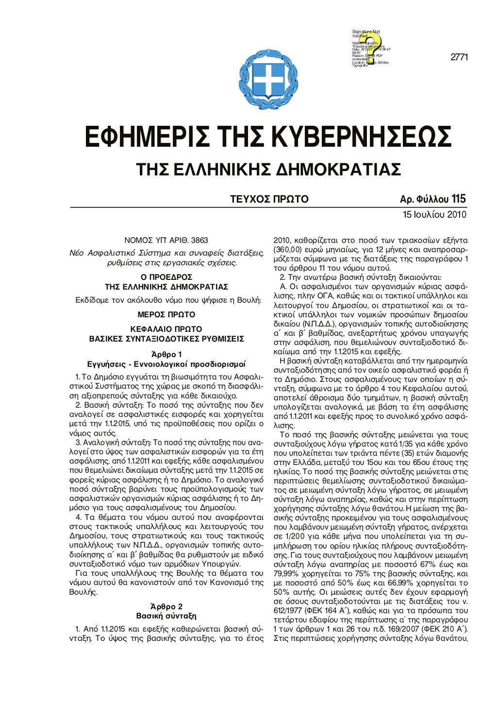 1. Από 1.1.2015 και εφεξής καθιερώνεται βασική σύνταξη. Το ύψος της βασικής σύνταξης, για το έτος 2010, καθορίζεται στο ποσό των τριακοσίων εξήντα (360,00) ευρώ μηνιαίως, για 12 μήνες...