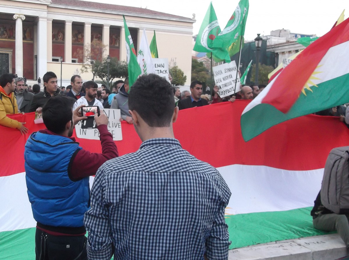Παρασκευή μεσημέρι. Στο Πολιτιστικό Σύλλογο των Κούρδων στην Αθήνα, παρέες παρέες Κούρδων παρακολουθούν με αγωνία και ενδιαφέρον, με δορυφορική σύνδεση, τα τελευταία νέα από τα κουρδικά κανάλια.