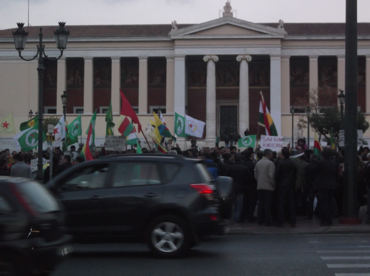 Από την συγκέντρωση της 1ης του Νοέμβρη, μέρας παγκόσμιας αλληλεγγύης στο Κομπανί, στα Προπύλαια του Πανεπιστημίου Αθηνών.