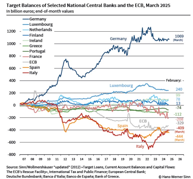 Δηλαδή, για την παραγωγικότητα της εργασίας, από την οποία εξαρτώνται οι μισθοί, οπότε η ζήτηση, η κατανάλωση και το βιώσιμο ΑΕΠ, για την εξέλιξη του κόστους εργασίας ανά μονάδα παραγομένου προϊόντος, αφού από αυτήν εξαρτάται πια η ισοτιμία του «ελληνικού ευρώ», για τα υπόλοιπα της χώρας μας στο σύστημα Target 2 και πού οφείλονται, όπου εμείς τα βρίσκουμε στα -74 δις € στα τέλη Μαρτίου του 2025, όπως θα καταθέσουμε στα πρακτικά κλπ.
